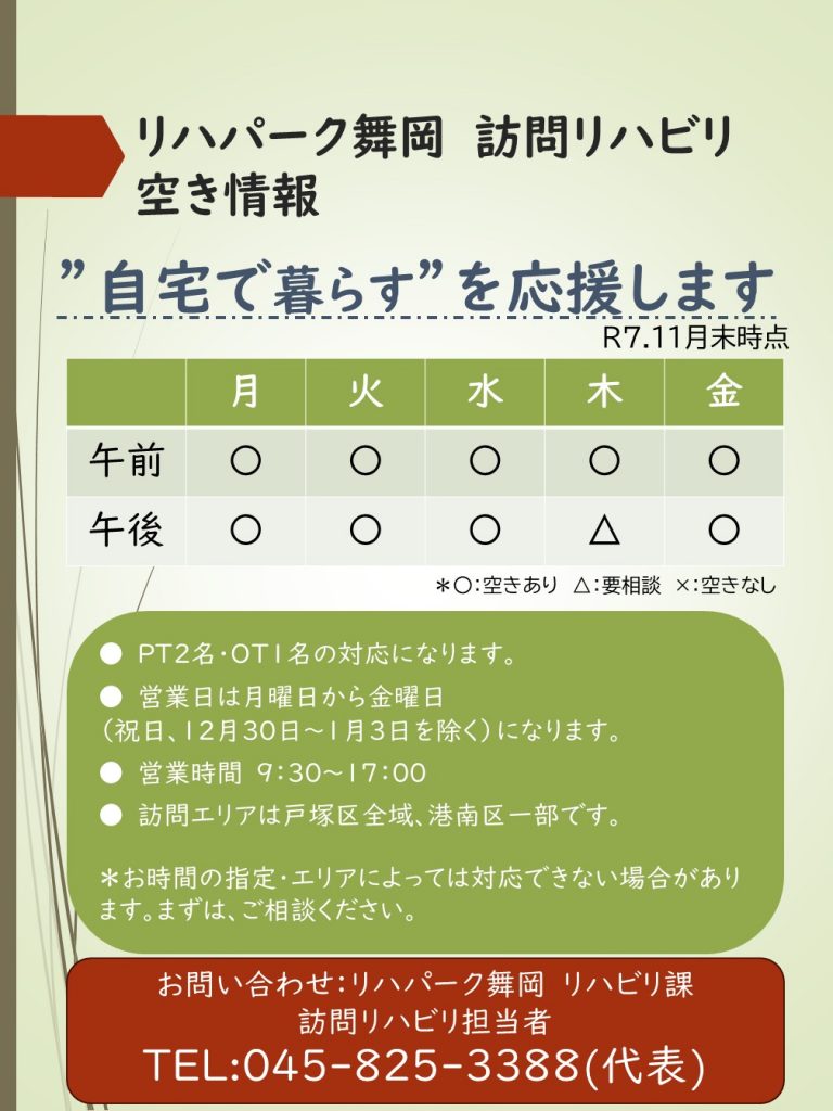 訪問リハビリ R7.12月度 空き情報のお知らせ 2025/12/1 お知らせ 訪問リハビリからお知らせです。 R7.11月末時点でのご利用状況を更新いたしました。 12月から職員増員し終日3名体制での訪問リハビリとなります。 ご連絡お待ちしています。